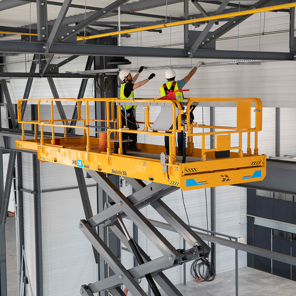 The HS18 E MAX scissor lift is equipped with a broad work platform with two extensions. The work area can reach up to 7.40 m long, allowing space for up to 4 workers while also leaving room for tooling and other supplies/equipment.