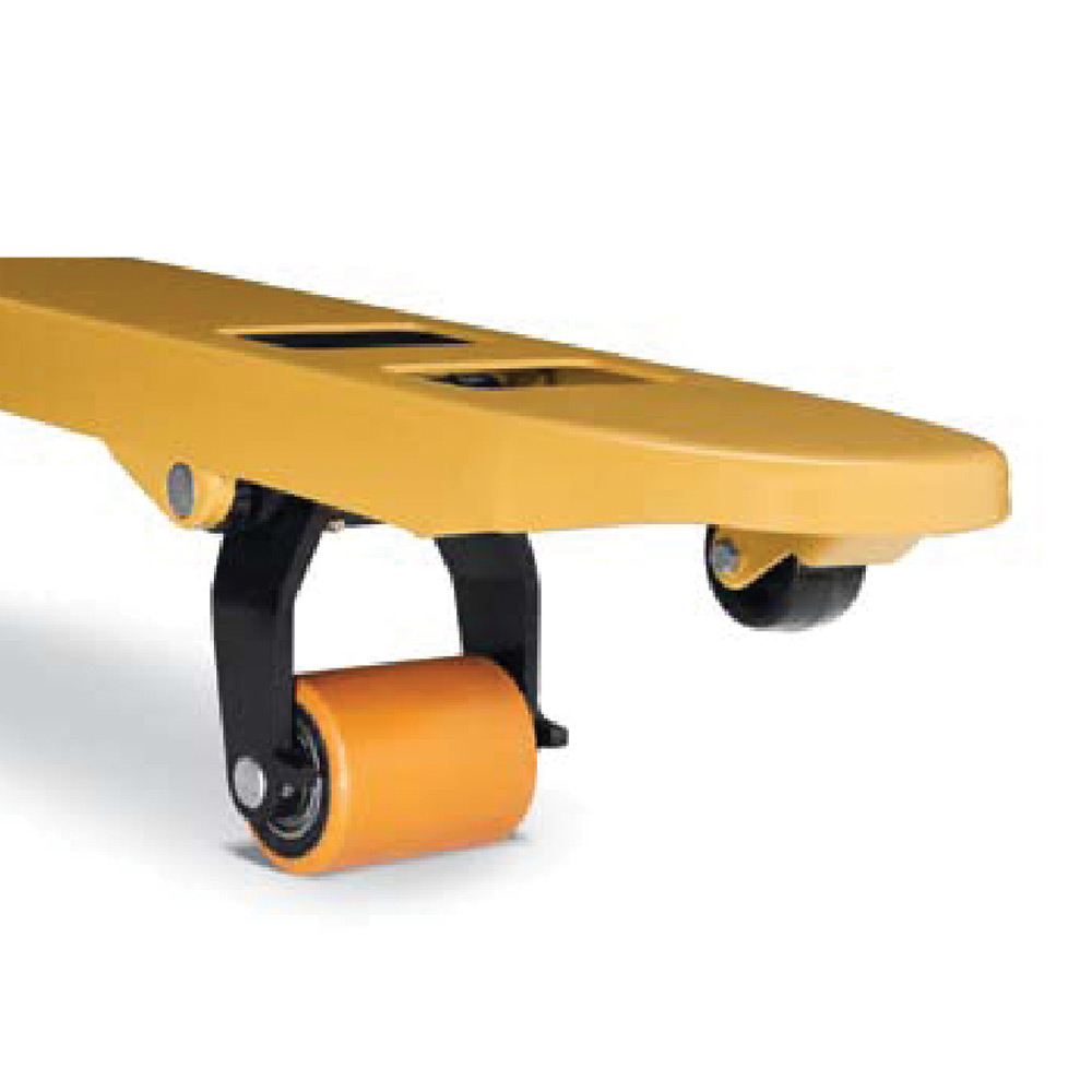 The pallet jacks steer and load wheel construction features low resistant polyurethane for smooth performance and handling. The roller system also provides trouble-free pallet entry and exit.